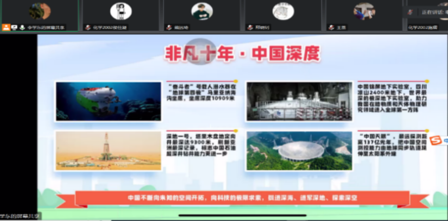 化学2101班,环科2001班,环工2203班团支书带领全班同学温故了由过去五年的工作和新时代十年的伟大变革,到开辟马克思主义中国化时代化新境界,由实施科教兴国战略强化现代化人才支撑,发展全过程人民民主,到保障人民当家作主的战略。环工2202班团支书带领同学们学习共产党章程,经过又一轮的学习,同学们对新时代中国特色社会主义、党的二十大精神有了更深刻的理解与感悟。研环境2258班团支书还开展了有奖知识竞答、你来做我来猜等活动调动了同学们的积极性。最后在大家合唱团歌后结束团日活动。