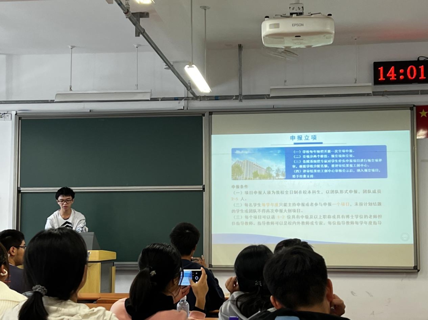 接着是优秀代表,应化2001刘行健从时间线角度讲述了大创进行的流程,细致讲解了参与大学生创新创业项目要进行的工作并分享科创竞赛方面的经验,清晰地阐明了大创项目大致由立项、中期评审、结项(延期结项)三部分组成。刘行健建议配队人数在二到三人左右,能使分工更为明确,有助于项目的进行。此外,刘行健还讲述了项目申报阶段的实施流程,强调了联系导师并不是一件难如登天的事,鼓励同学们积极联系有关老师、学长学姐。