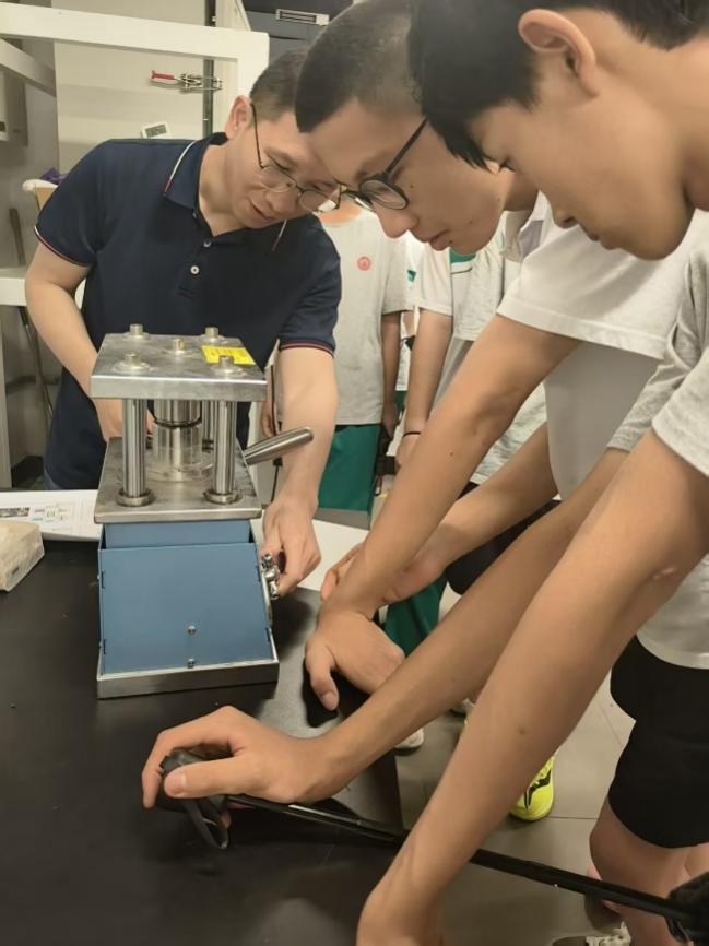 在电化学实验室,史永正老师通过简洁的PPT与电池剖面模型,向大家介绍了固态锂金属电池的优势、离子传导机理以及在“双碳”目标背景下的应用前景。随后,同学们围在手套箱前,近距离观看锂电池正负极极片、固态电解质组装等关键步骤。在随后的实践环节中,同学们以小组为单位,在指导教师的“手把手”指导下,亲自体验锂电池组装的最后工序——使用封装机将正极、负极与固态电解质膜紧密压合。自制纽扣电池接入测试线路后,在众人注视下,LED灯泡被成功点亮,实验室内爆发出热烈欢呼。这束光不仅印证了实验的成功,也点燃了同学们对能源科技的热情与好奇。