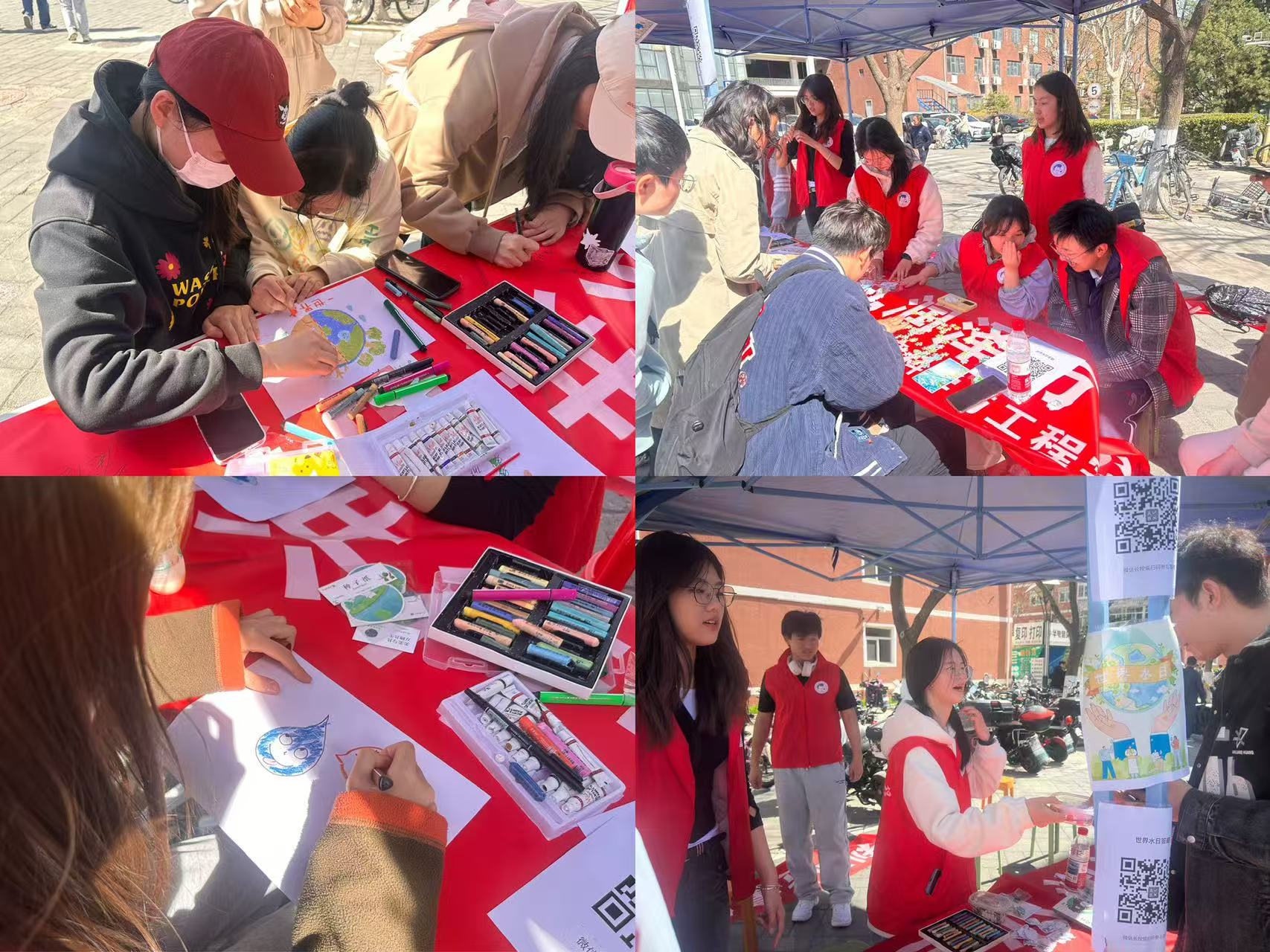活动准备了丰富的水资源知识题目,涵盖水源基本常识、节水技巧、水环境保护等内容。同学们可以通过答题挑战自己的知识储备,赢取水杯贴画、保护地球勋章等文创奖品;活动现场还设置了创意绘画区,为参与者准备了丰富多样的绘画工具和材料。在这里,每一位参与者都能化身为环保艺术家,用画笔展现着人与自然和谐共生的美好画面,用五彩斑斓的颜料勾勒出心中理想的水资源图景,每一幅画作都承载着创作者对水资源保护的独特理解与美好期许;现场还设有“困难模式”的拼图区,以直观形式敲响警钟。以“破碎与重生”为核心,展现海洋塑料污染等场景的120片拼图,需要同学们团队协作复原完整生态图景。“当最后一片塑料垃圾拼图放入'海洋'时,我突然明白——我们拼合的不只是图案,更是对生命之源的一份承诺。”参与拼图活动的同学如是说;桌上另铺有签名横幅,参与者可以在横幅上写下自己的想法,包括具体行动,节水承诺等。从“一水多用”到“低碳生活”,这些真挚的留言不仅是个人的环保宣言,更是汇聚成一股强大的社会力量,激励着更多人加入到水资源保护的行动中来。