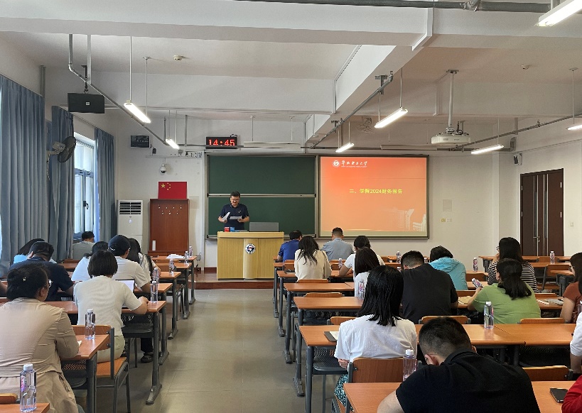 随后,学院办公室主任何杰涛作了财务工作报告。同时也希望学院老师们就教师发展和教师利益、如何充分发挥教职工民主监督和民主管理、提高教师在学院发展中的参与度、如何更好维护教师切身利益等方面积极建言献策。