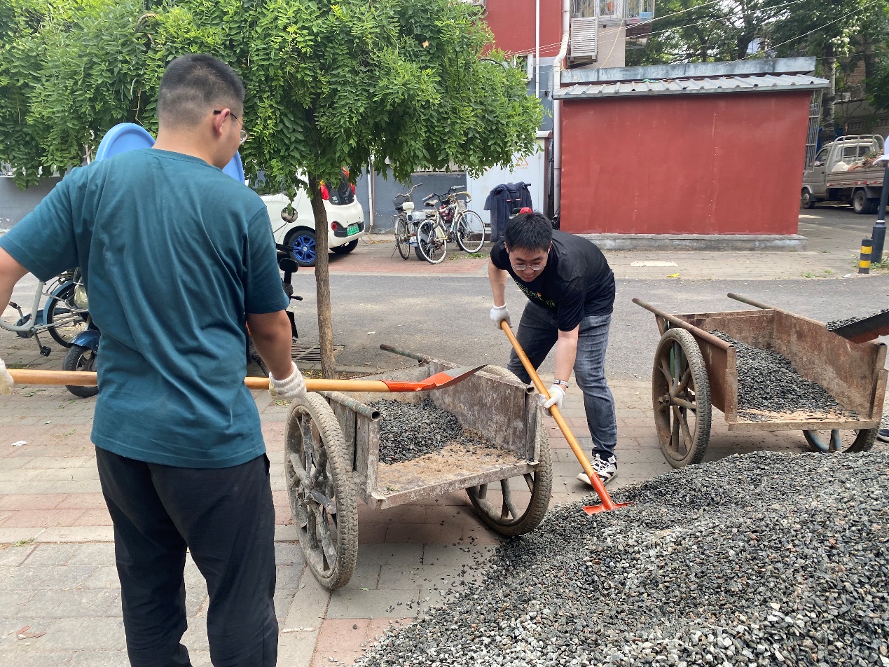 活动伊始,由长城润滑油社区党支部带领志愿者们来到现场介绍了花园现状,由清华同衡第十四党支部胡老师为我们志愿者讲解了本次改造方案、改造流程以及活动分工和注意事项。随后,在aa3044永利集团研究生辅导员许襄宁的带领下,志愿者们撸起袖子、拿起铁锹投身到花园清理工作,从场地垃圾清理及拆除到种植箱及后续进行的木桩修补,从平整路面到石子路的铺设,从植物补种到入口标识的更新,花园中随处可见志愿者们劳动的身影。头顶烈日,冲锋在前,在改造过程中,志愿者们以实际行动践行着“奉献、友爱、互助、进步”的志愿精神。经过两天的努力,小区花园焕然一新,重新恢复了生机与活力!