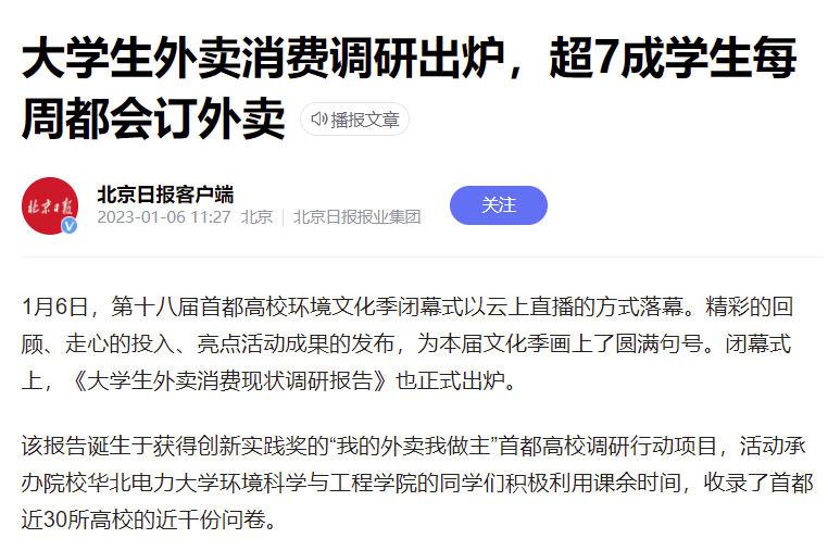 该项目由环境学院负责,环科1902郝思雅担任本届首都高校环境文化季执委会副主任席。期间,组织同学们积极利用课余时间完成,共收录了首都近30所高校的近千份问卷,项目产出的《大学生外卖消费现状调研报告》数据详实,亮点纷呈,充分客观反映了首都高校学生的外卖订购频次、一次性餐具使用情况、外卖垃圾分类投入情况和重复使用情况等,并开展了关于一次性餐具可能带来的潜在污染和浪费的科普宣传。该项目引领首都高校学子及更多的社会公众参与其中,引发了校园与社会在生态环保领域的同频共振。