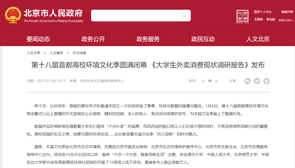 1月6日,由北京市生态环境局、共青团北京市委员会指导,北京市生态环境保护宣传中心、北京市学生联合会、北京市志愿服务指导中心主办的第十八届首都高校环境文化季闭幕式在线上举行,aa3044永利集团承办的“我的外卖我做主”首都高校调研行动项目荣获创新实践奖,受到北京市人民政府、北京日报、中国日报网、北京青年报等多家主流媒体广泛关注报道。