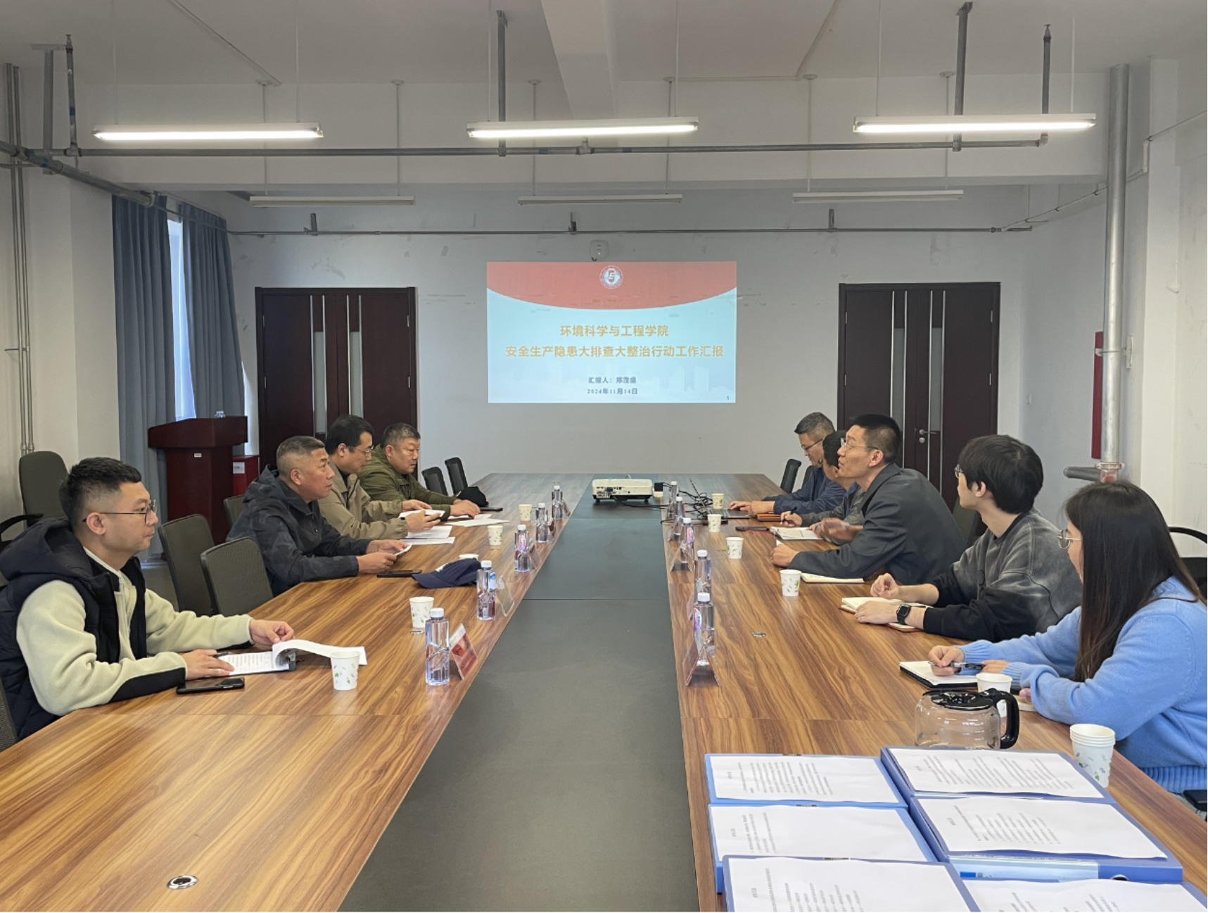 学院副院长郑茂盛首先就学院成立安全生产隐患大排查大整治行动工作小组召开安全工作会议、明确责任分工,对全院师生开展安全教育学习,制定学院安全生产隐患大排查大整治行动工作计划方案,建立学院实验室安全、心理健康排查安全隐患台账,建立健全学院相关安全制度,对实验室重点目标,重点部位等安全隐患清晰排查,制定危险物品管理相关使用规定,对学生等重点关注对象充分了解掌握等几个学院重点安全生产工作方面进行了汇报。