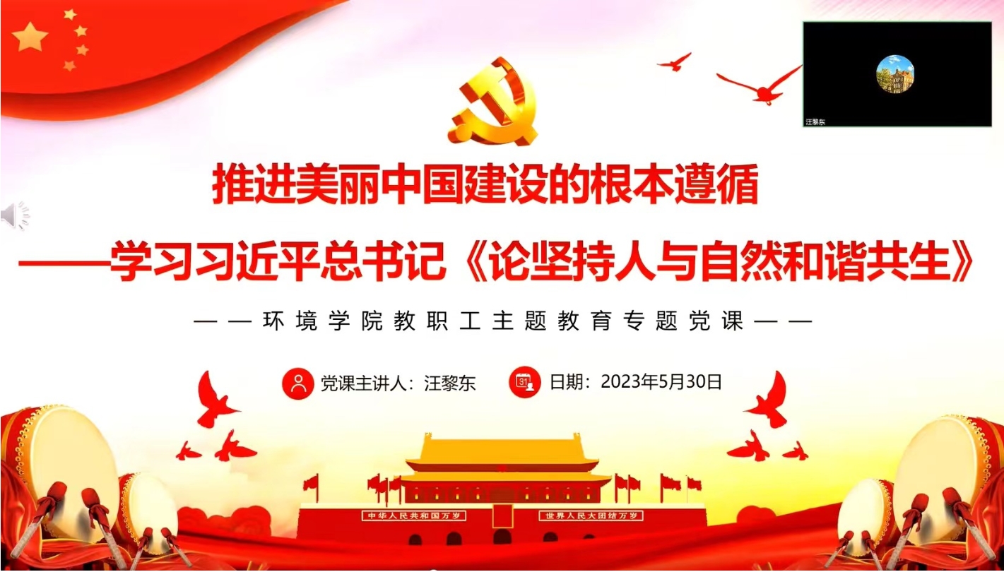 5月30日,学院院长汪黎东给全体教职工讲授了题为学习习近平总书记《论坚持人与自然和谐共生》的主题教育专题党课。党课深入学习了习近平生态文明思想,强调完整、准确、全面贯彻新发展理念的重要性。