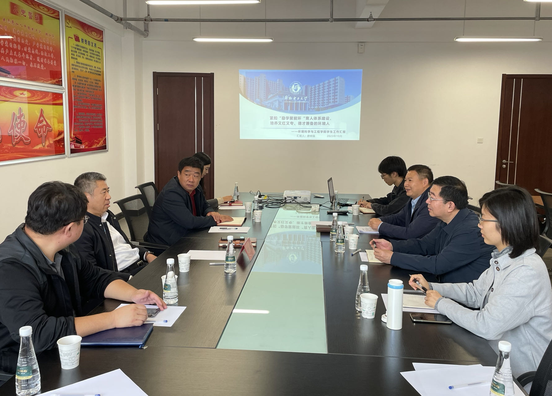 刘威听取了学院学生工作汇报。陈志表示,学院党委高度重视学生工作,对照学校党委要求,围绕学生、服务学生、关爱学生,切实为学生成长成才、提升思想政治教育水平提供支持和有力指导。薛明磊以“紧扣‘励学聚能环’育人体系建设,培养又红又专,德才兼备的环境人”为主题,从“千方百计抓学风”、“千防万守保安全”、“千家万户促就业”、“千军万马强队伍”、“一心一意树品牌”五个方面,详细介绍了学院在学风建设、安全稳定、就业创业、队伍建设和特色品牌建设方面开展的工作。学院坚持“育人为本、创新驱动”,通过支部聚魂、导师引路、学生聚力、媒体鼓劲四阵地联合驱动,聚焦支部共建,科研育人,队伍建设,心理健康,网络思政五项重点工作,初步建成“励学聚能环”育人体系。